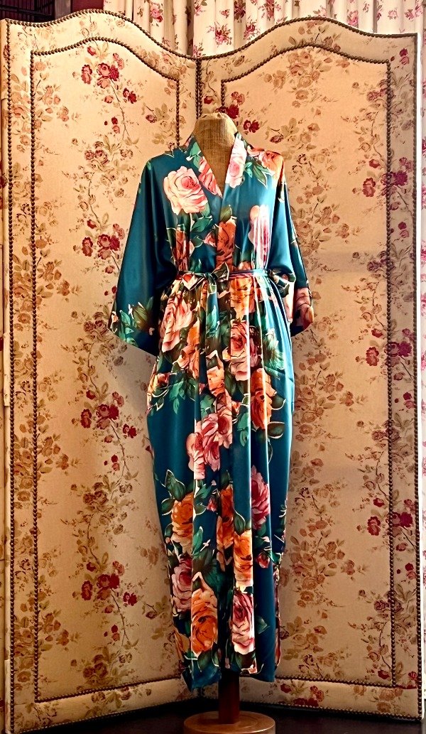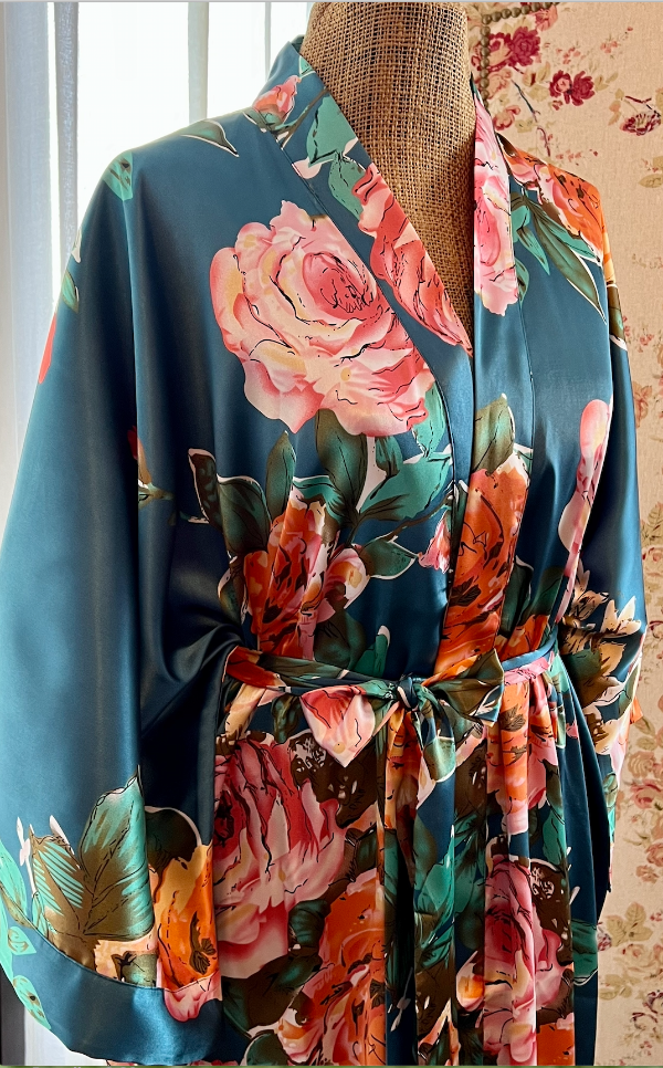 Kimono de satén de seda, estampado con motivo floral fondo verde petróleo y flores en distintos tonos de rosas, naranja; hojas verde menta y seco.
