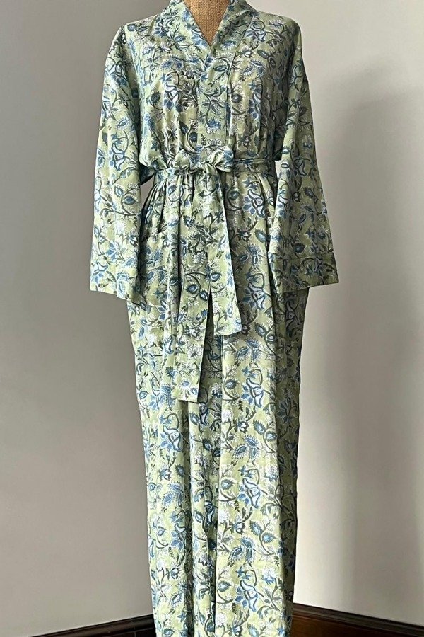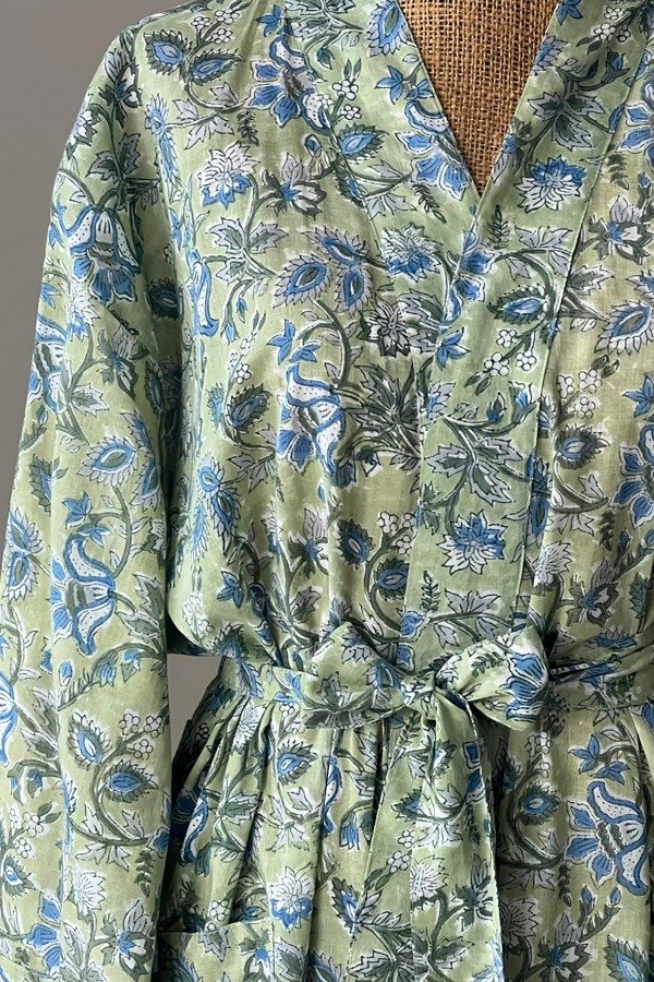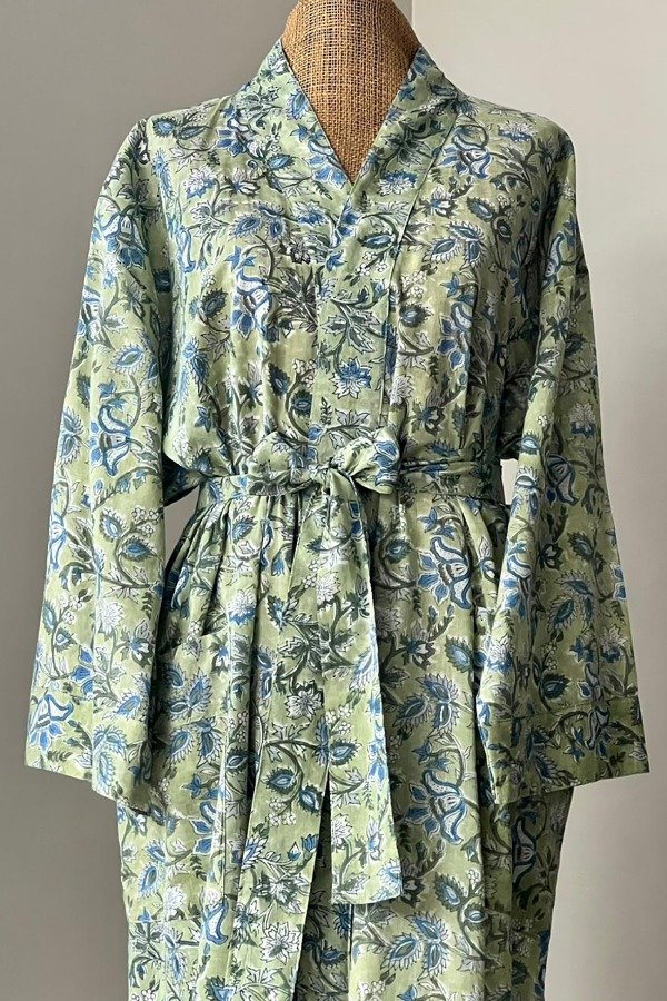 Kimono de puro algodón, largo estampado con un bloque de madera, un arte ancestral indio.