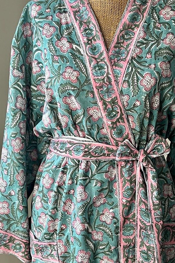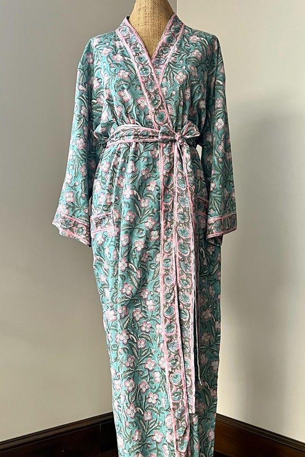 Kimono de puro algodón, largo estampado con un bloque de madera, un arte ancestral indio.