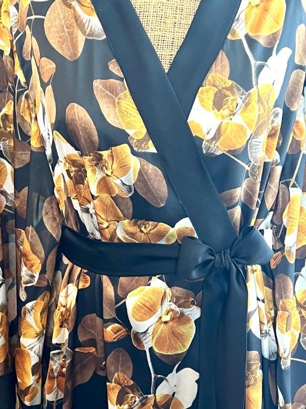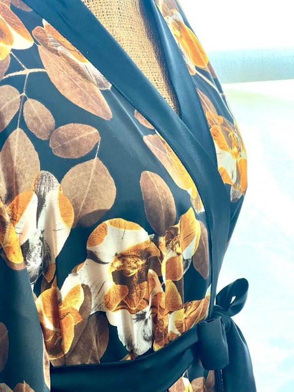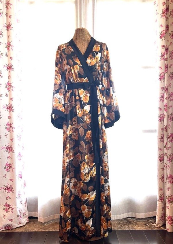 Kimono de satén de seda, sobre base negra, estampado con flores en tonos color caramelo y crudo, hojas marrones ; vistas y lazo en satén negro.