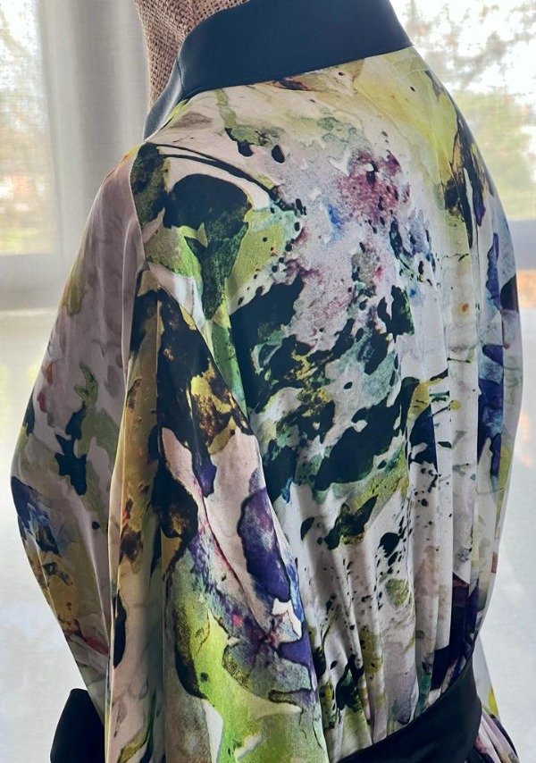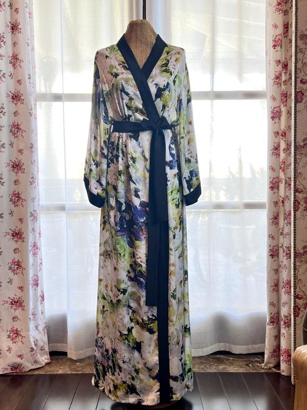 Kimono de satén de seda, sobre base blanca, flores organicas en gris, verde, azul violáceo; vistas y lazo en satén negro.