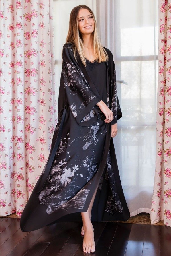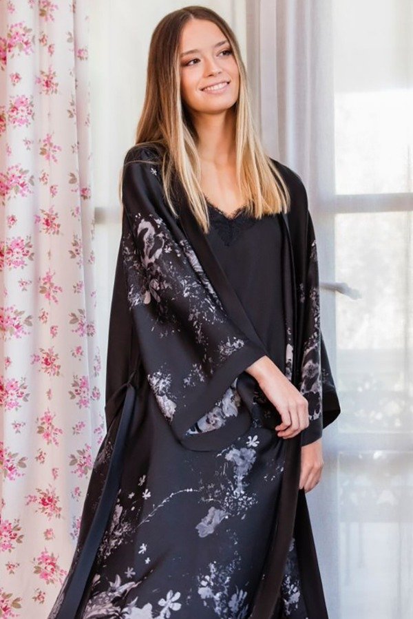 Kimono de satén de seda fondo negro, estampado con flores desdibujados en distintos tonos de grises desdibujadas; vistas y lazo en satén negro.