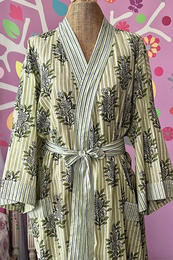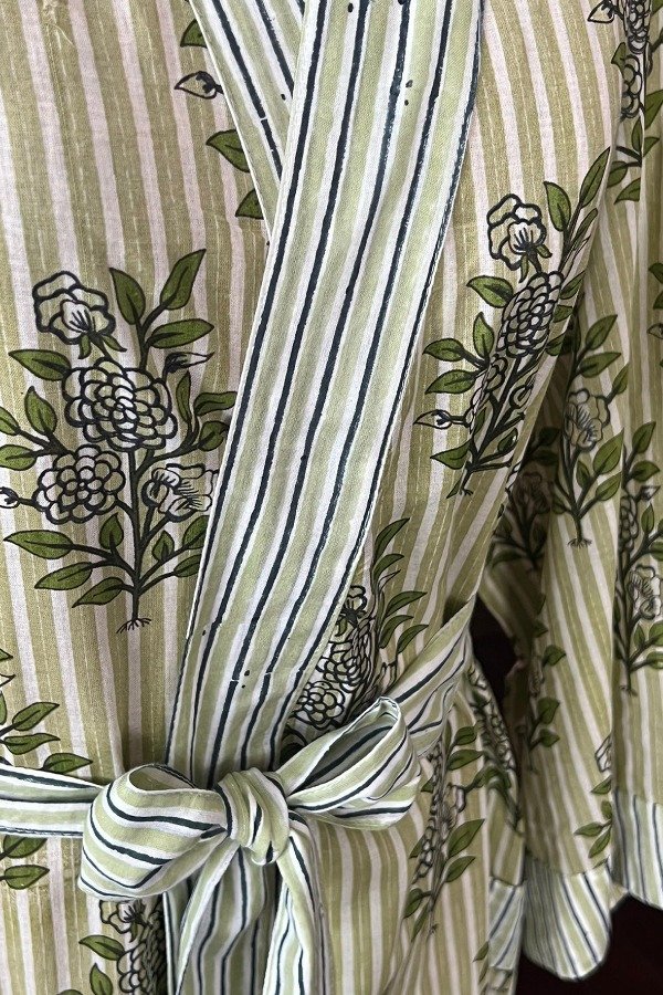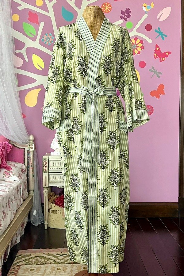 Kimono de puro algodón, largo estampado con un bloque de madera, un arte ancestral indio.