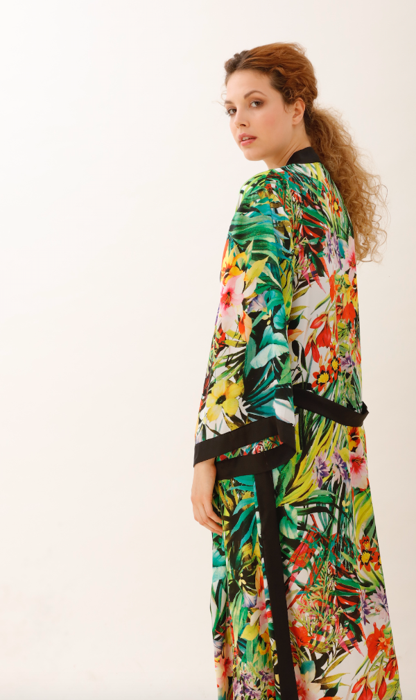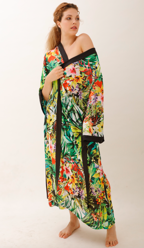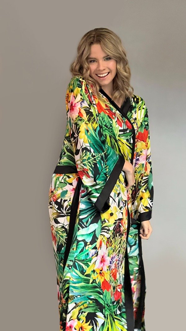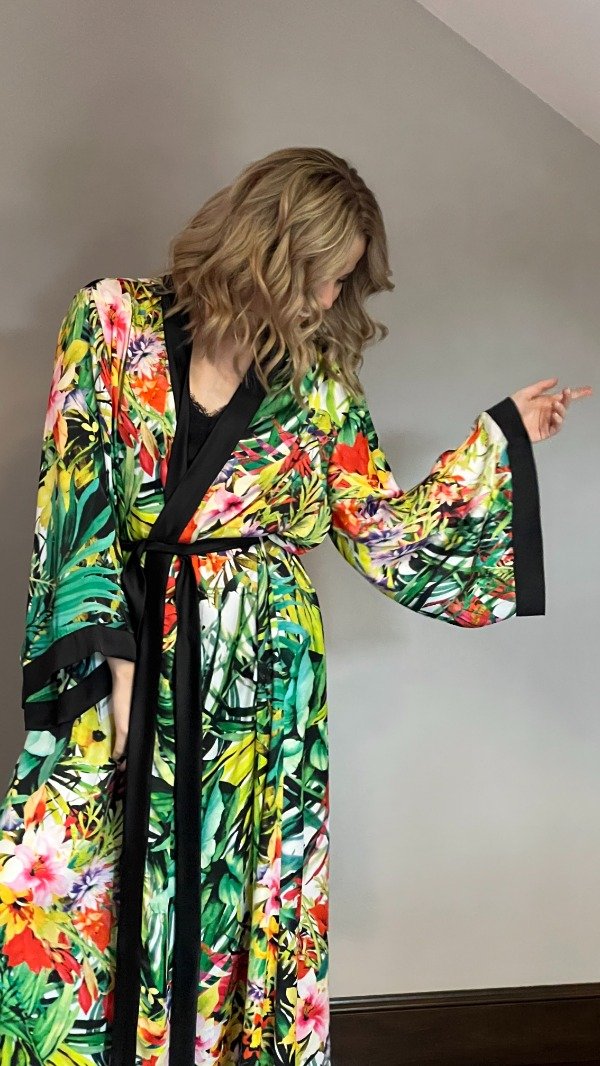 Kimono de satén de seda, base negra, estampado con hojas verde menta, verde lima, verde seco y flores naranjas, rosas, verde lima.