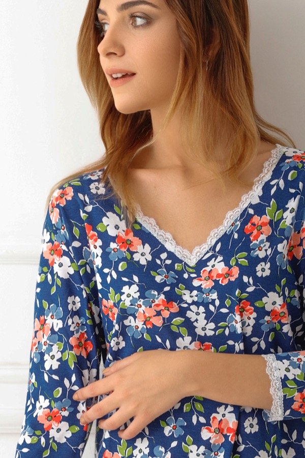 Remera escote en V con manga tres cuartos, detalle de puntilla en escote y mangas. Pequeña abertura lateral.